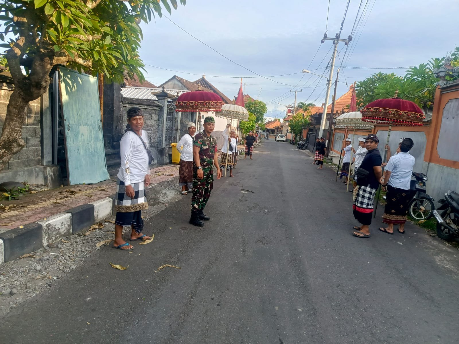 Klungkung,- Babinsa Jumpai Koptu Made Nuriana bersinergi bersama Bhabinkamtibmas dan pecalang kembali terjun untuk melaksanakan pengawalan dan pengamanan berlangsungnya kegiatan Ide Bhatara Mesolah di depan Balai Banjar Adat Kangin Desa Jumpai, Kamis ( 03/04/25 ) malam.
