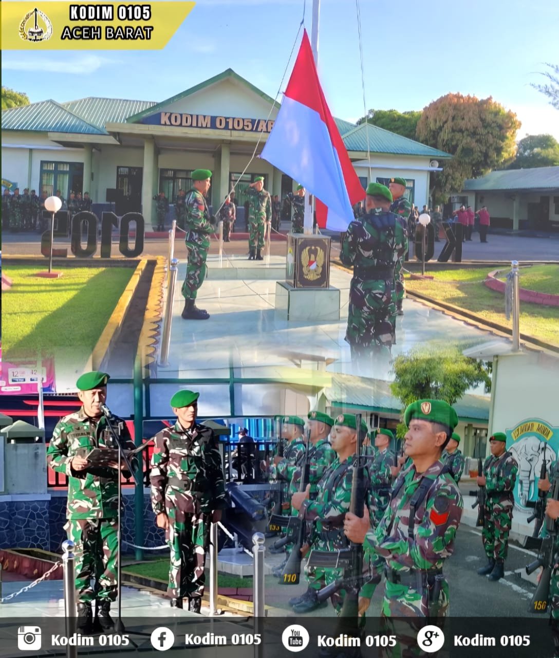 ACEH BARAT — Dandim 0105/Aceh Barat Letkol Inf S. Kembaren, S.E., M.I.P., CFrA., yang diwakili Kepala Staf Kodim (Kasdim) Mayor Cke Teguh Widodo, memimpin Upacara Bendera Merah Putih rutin yang diikuti oleh para Perwira Staf, Danramil/Danposramil, serta seluruh prajurit dan PNS. Upacara dilaksanakan di Lapangan Apel Makodim 0105/Aceh Barat, Jalan Imam Bonjol, Desa Drien Rampak, Kecamatan Johan Pahlawan, Kabupaten Aceh Barat, Senin (22/12/2025).