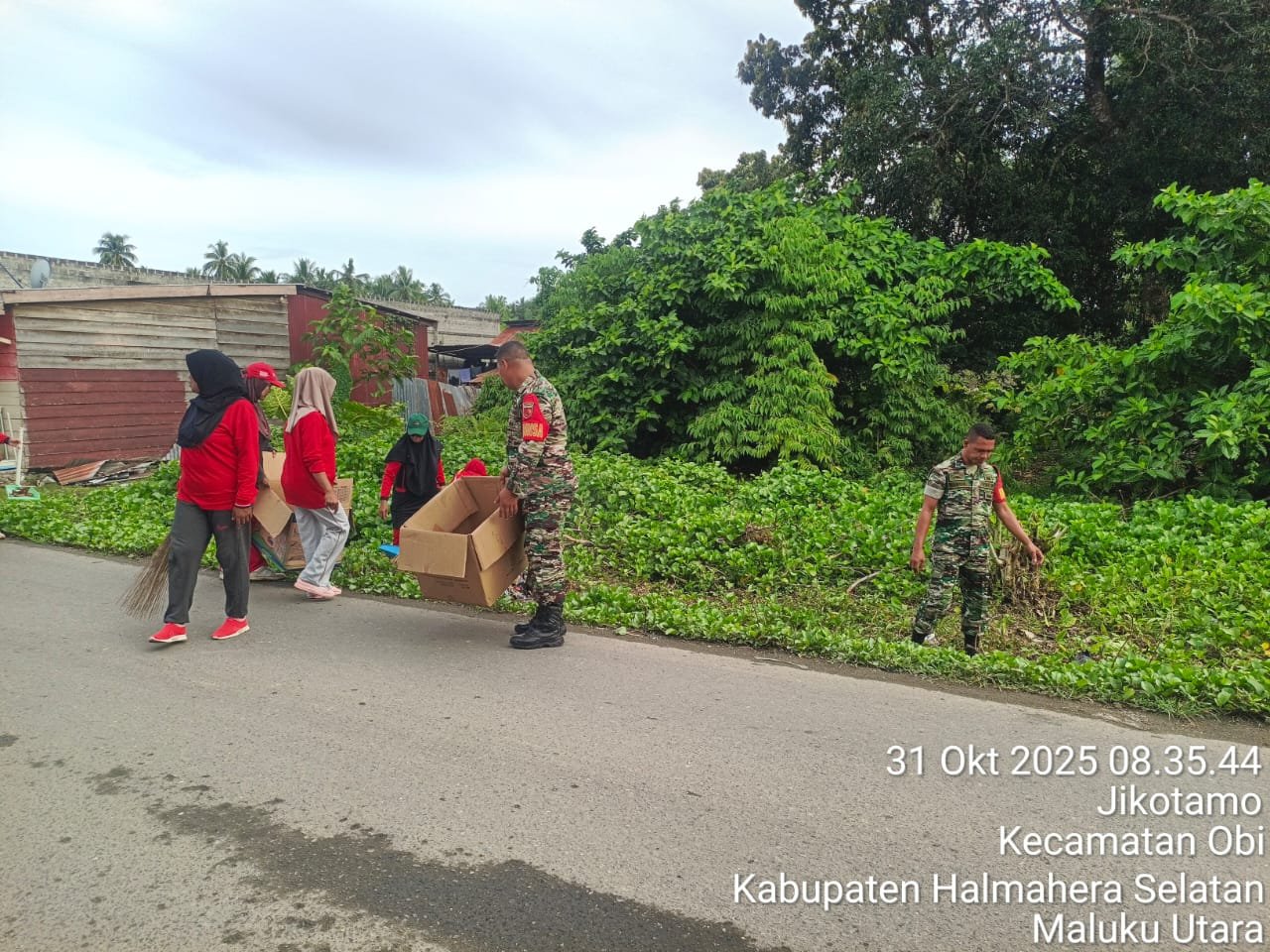 HALMAHERA SELATAN – Dalam mewujudkan lingkungan yang bersih dan asri, Babinsa Koramil 03/Obi Kodim 1509/Labuha Personil Babinsa bersama warga Desa Jikotamo kerja bakti membersihkan ranting dan rumput, di Lingkungan Perumahan warga, Jumat (31/10/2025).