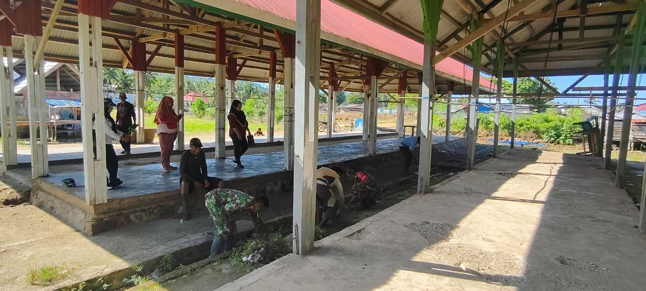 Babinsa Kodim 1429/Butur Dipimpin Serda Ramdhan bersama warga masyarakat melaksanakan kegiatan kerja bakti membersihkan pasar