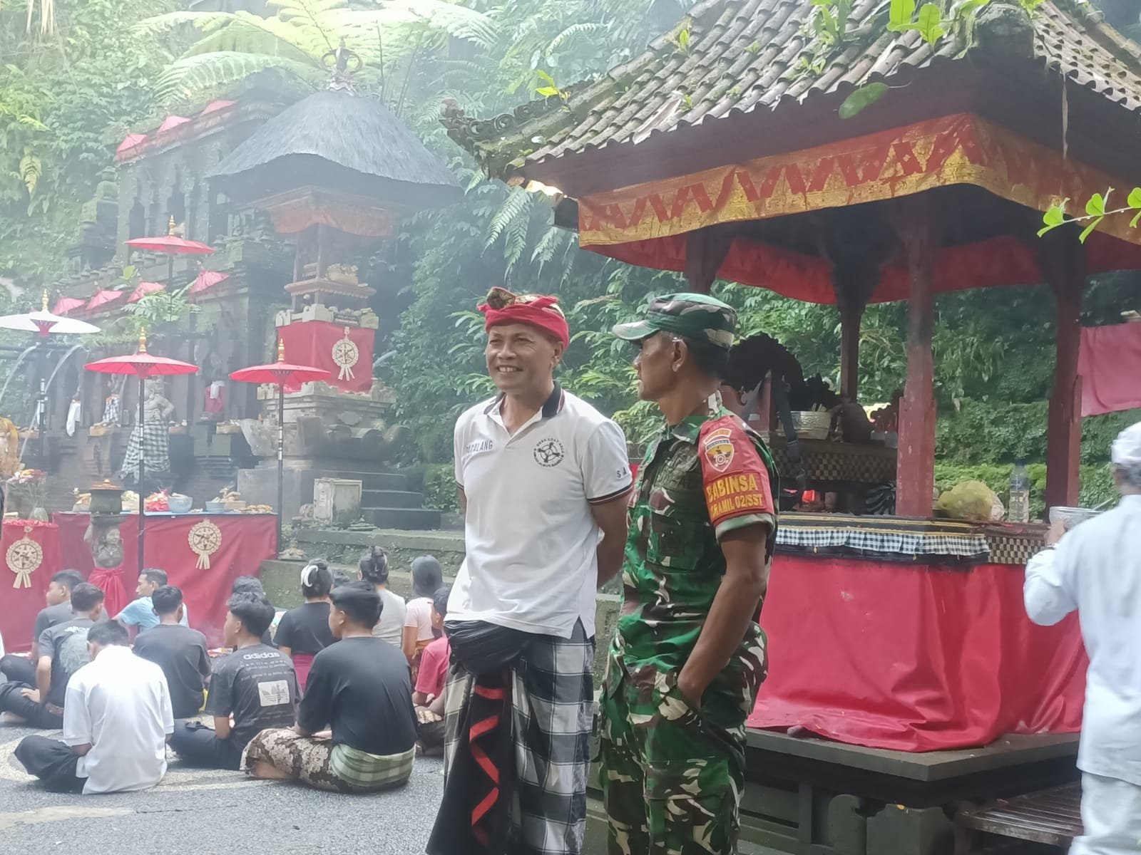 Bangli – Dalam rangka memberikan rasa aman dan nyaman kepada masyarakat serta wisatawan, Babinsa Desa Abuan Koramil 1626-02/Susut Kodim 1626/Bangli, Sertu I Dewa Gede Mertawan bersama Bendesa Adat Sala melaksanakan kegiatan pemantauan perayaan Hari Raya Banyupinaruh di obyek wisata spiritual Pura Taman Pecampuhan Sala, Banjar Dinas Sala, Desa Abuan, Kecamatan Susut, Kabupaten Bangli.