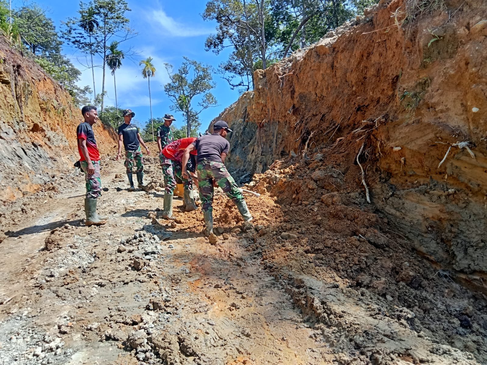 Tanpa menunggu datangnya alat berat, para personel memilih bekerja dengan cara sederhana. Jalur air dibuat secara manual untuk menghindari genangan yang dapat berubah menjadi lumpur tebal. Air yang sebelumnya mengendap kini diarahkan mengalir, seperti membuka urat nadi agar jalan tetap hidup.