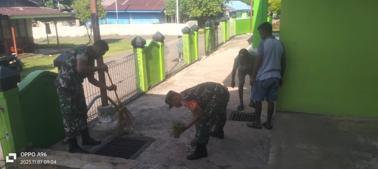 Halmahera Tengah-Kegiatan Program Satuan Kodim 1512/Weda, Kegiatan Jumat berkah Pembersihan sampah dan rumput di seputaran (Rumah ibadah) bertempat di Desa. Sanafi Kacepo, Kecamatan. Pulau Gebe, Kabupaten. Halmahera Tengah.Jumat, (07/11/2025)