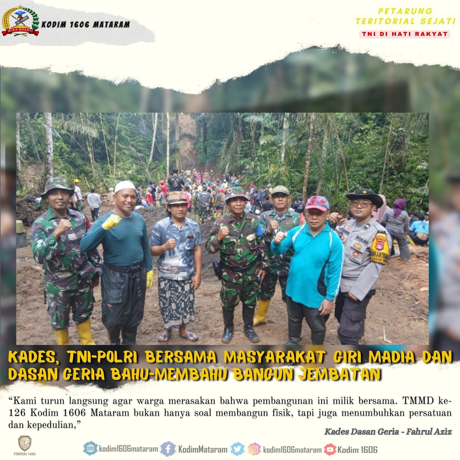 Lombok Barat, NTB — Semangat gotong royong dan persaudaraan terasa begitu kuat di Dusun Batu Santek, Desa Dasan Geria, Kecamatan Lingsar. Dua Kepala Desa (Kades), Kades Dasan Geria dan Kades Giri Madia, tak ragu turun langsung bersama warga dalam proses pengecoran Jembatan Sasaran 3 Program TNI Manunggal Membangun Desa (TMMD) ke-126, Komando Distrik Militer (Kodim) 1606/Mataram yang menghubungkan Dusun Batu Santek–Dasan Geria dengan Dusun Matak–Desa Giri Madia, Selasa (21/10/2025).