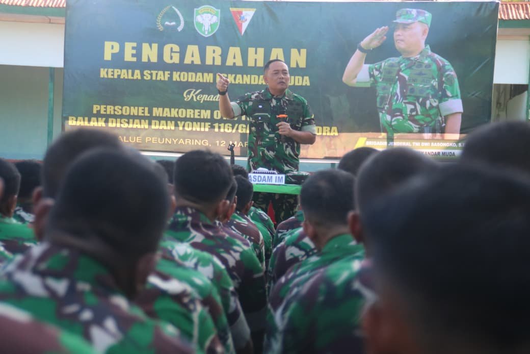 Aceh Barat – Kepala Staf Kodam Iskandar Muda (Kasdam IM) Brigjen TNI Dwi Sasongko, S.E., M.H., memberikan pengarahan kepada personel Makorem 012/Teuku Umar, Balak Disjan, serta prajurit Yonif 116/Garda Samudra, Rabu (11/3/2026).