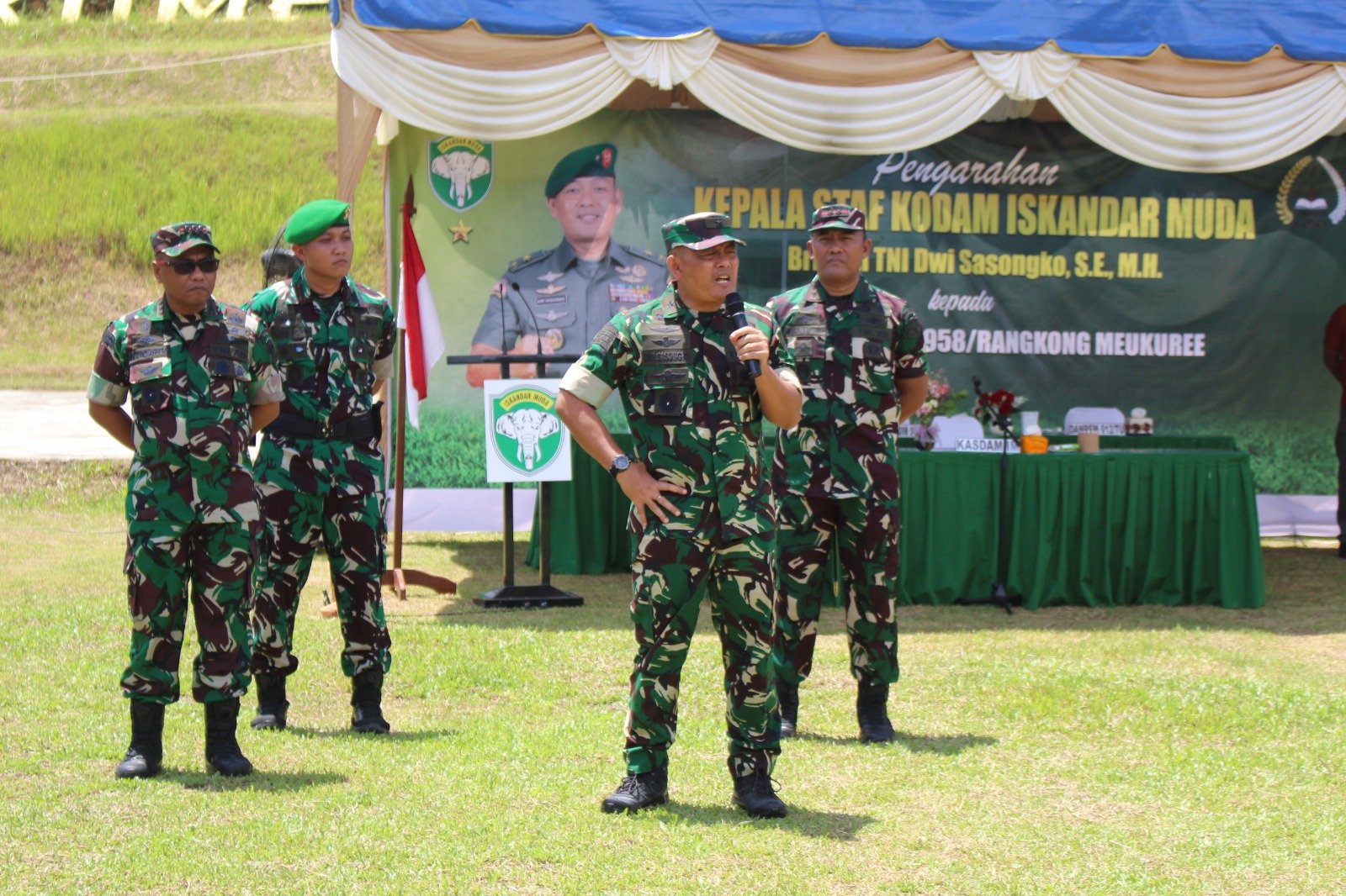 Aceh Barat Daya – Kepala Staf Kodam Iskandar Muda (Kasdam IM) Brigjen TNI Dwi Sasongko, S.E., M.Han meninjau ratusan prajurit yang baru tiba di Batalyon Teritorial Pembangunan (Yon TP) 958/RM yang berlokasi di Desa Rambung, Kecamatan Setia, Kabupaten Aceh Barat Daya, Rabu (11/3/2026).