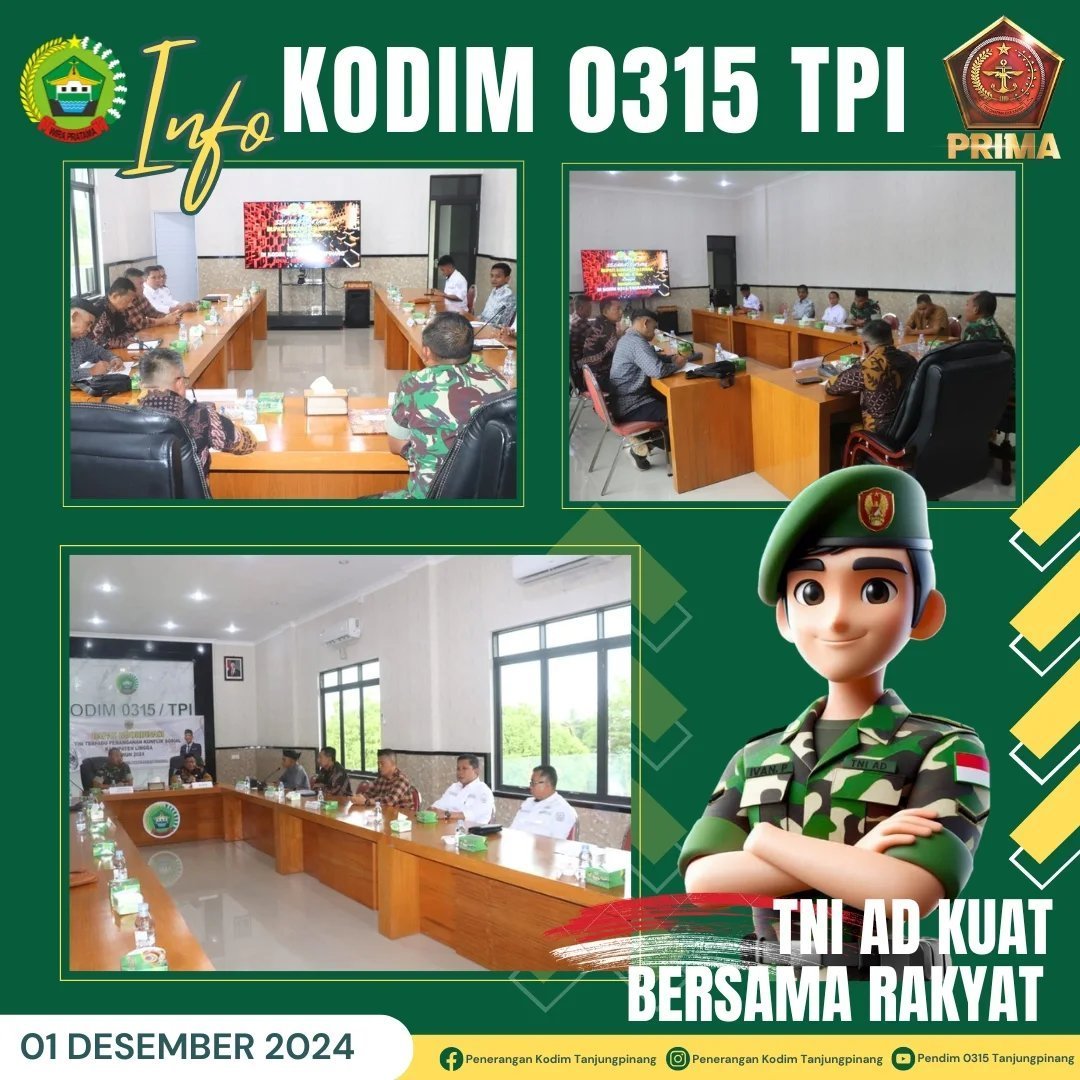 Kodim0315 – Kasdim 0315/Tanjungpinang Letkol Inf Moch. Denny Nurcahyono, SH. M.Han mengikuti Rakor Tim Terpadu Penanganan Konflik Sosial Kabupaten Lingga Tahun 2024, Selasa (10/12/2024) sore. Kegiatan berlangsung di Ruang Rapat Makodim 0315/Tanjugpinang.