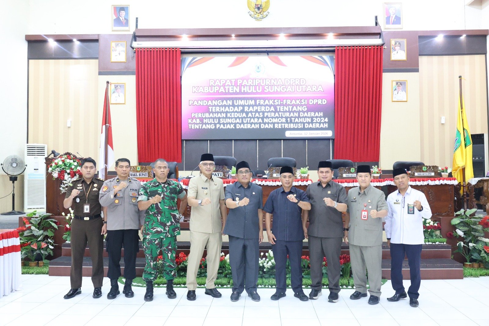 HULU SUNGAI UTARA – Kasdim 1001/HSU/BLG Mayor Inf Andi Tiro, mewakili Dandim 1001/HSU/BLG Letkol Inf Endra Retno Erowanto, S.Sos, M.I.P., hadiri rapat paripurna DPRD kabupaten hulu sungai utara yang membahas pandangan umum fraksi-fraksi terhadap raperda tentang perubahan kedua atas peraturan daerah kabupaten Hulu Sungai Utara no 1 tahun 2024 tentang pajak daerah dan retribusi daerah, bertempat Ruang Rapat Paripurna DPRD Lt ll, Kelurahan Murung Sari, Kecamatan Amuntai Tengah, Kabupaten Hulu Sungai Utara, Senin (12/01/2026).
