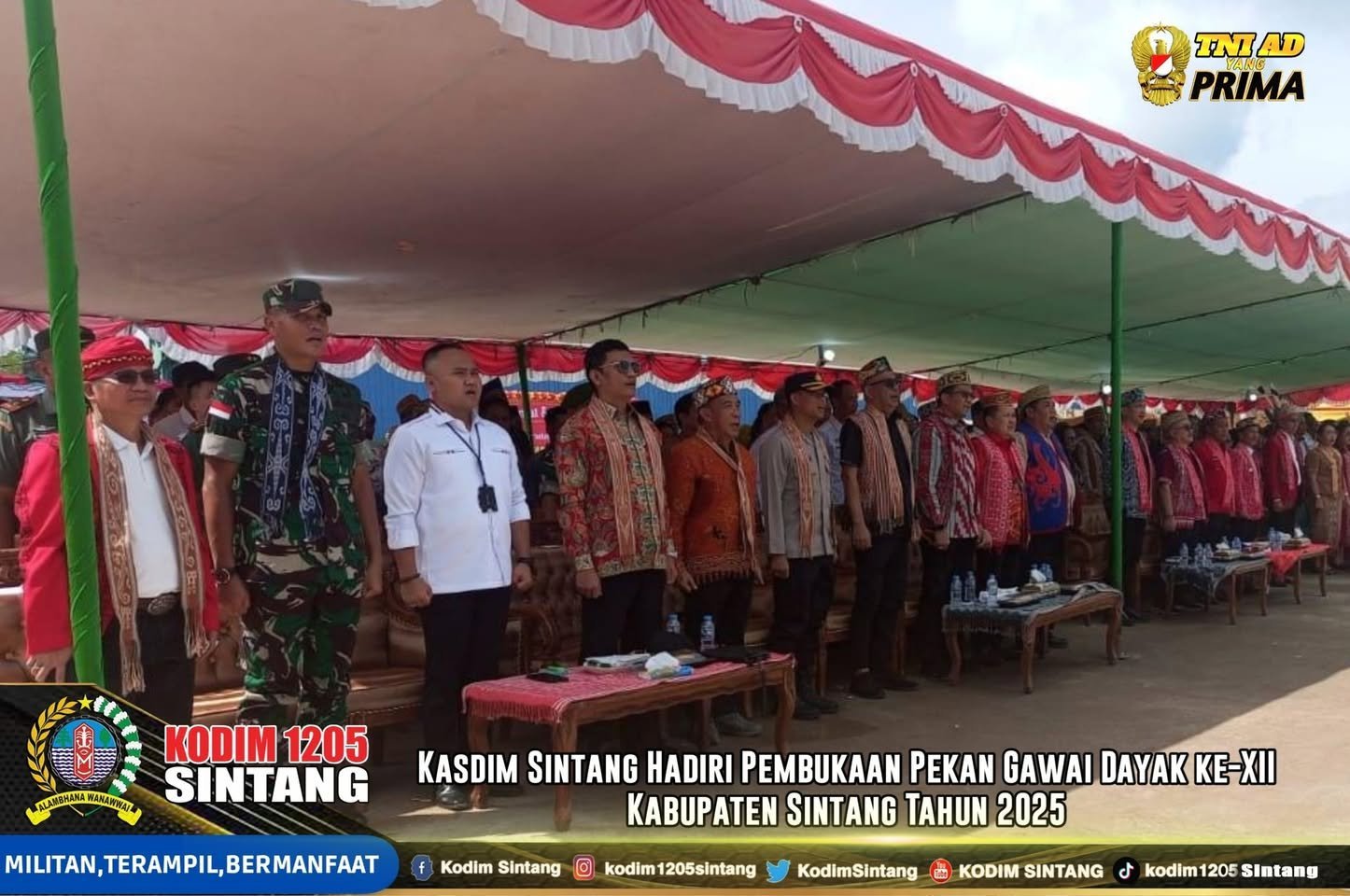 Sintang – Kodim 1205/Sintang menunjukkan dukungannya terhadap pelestarian budaya lokal dengan hadirnya Kepala Staf Kodim (Kasdim) Sintang, Mayor Inf Andreas dalam pembukaan resmi Pekan Gawai Dayak ke-XII Kabupaten Sintang yang dilaksanakan di Rumah Betang Tampun Juah, Rabu (16/7/2025).