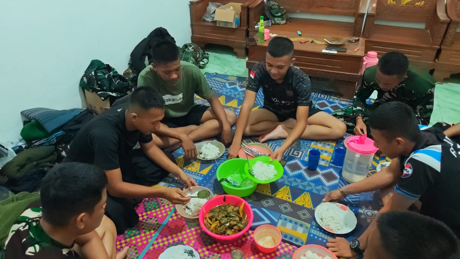 Kegiatan makan bersama tersebut dilakukan oleh personel Satgas TMMD yang terdiri dari berbagai satuan TNI setelah melaksanakan tugas pembangunan dan kegiatan sosial di lokasi TMMD. Momentum tersebut menjadi sarana mempererat hubungan antar personel di lapangan.