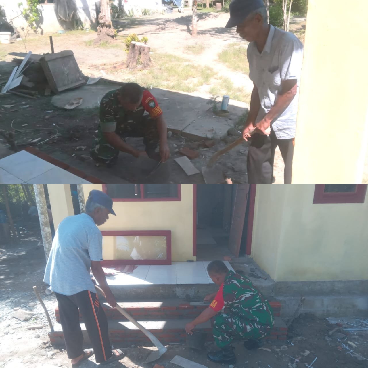 Kegiatan gotong royong tersebut berlangsung dalam suasana penuh keakraban dan kekeluargaan. Sertu Heru terlihat bekerja bersama warga, membantu pemasangan batu bata untuk membangun tangga rumah agar lebih kokoh, aman, dan layak digunakan. Kehadiran Babinsa di tengah masyarakat menjadi wujud nyata kedekatan TNI dengan rakyat.
