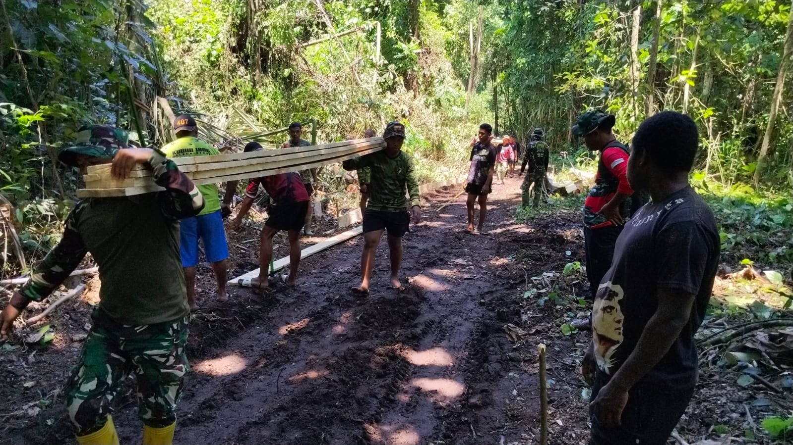 Kolaborasi antara anggota Satgas dan warga lokal ditunjukkan melalui pembuatan mal atau cetakan untuk pengecoran jalan. Masing-masing individu berkontribusi sesuai perannya untuk memperlancar pekerjaan yang sedang berlangsung.