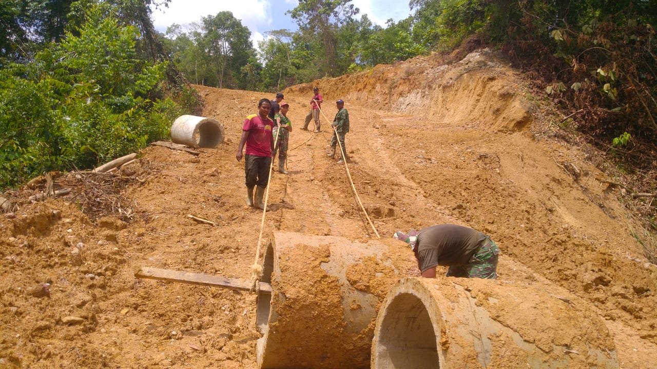 Di tengah kegiatan tersebut, Kapten Inf Amrin yang merupakan personel tertua di lokasi menyampaikan bahwa distribusi gorong-gorong menjadi bagian penting dalam pembangunan jalan.