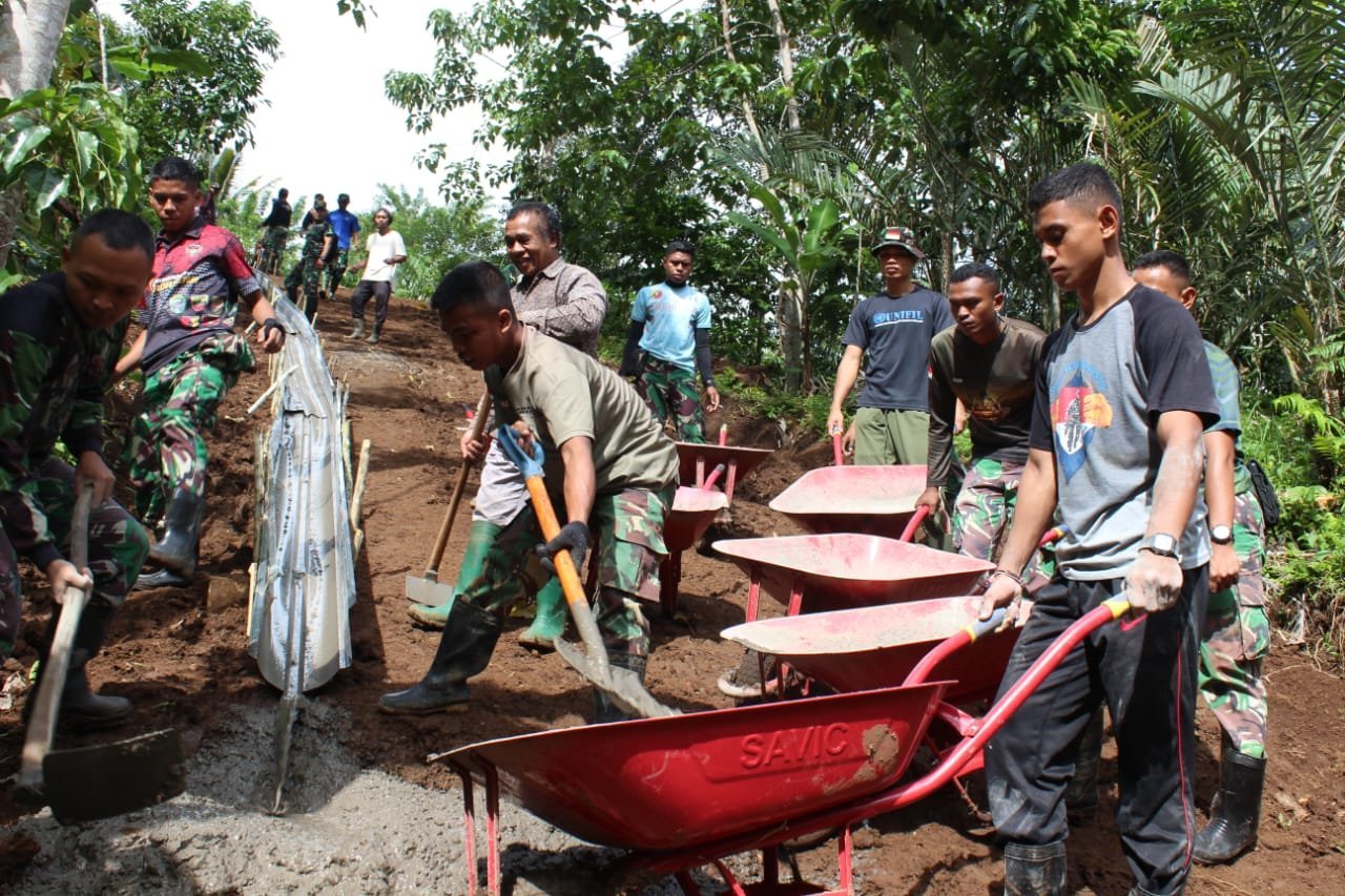 Selain anggota TNI, masyarakat setempat juga ikut serta membantu dalam proses pembangunan. Partisipasi aktif warga mencerminkan semangat kebersamaan dalam membangun infrastruktur desa yang lebih baik.