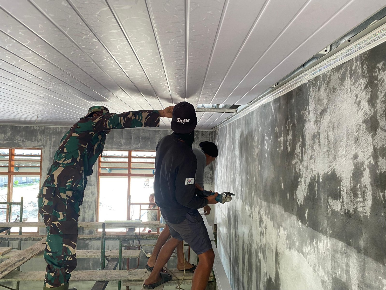 Pemasangan plafon dilakukan dengan teliti untuk memastikan hasil yang maksimal. Kopda Viktorius., yang turut mengawasi proses ini, mengungkapkan bahwa pengerjaan berjalan lancar berkat sinergi antara TNI dan masyarakat setempat.