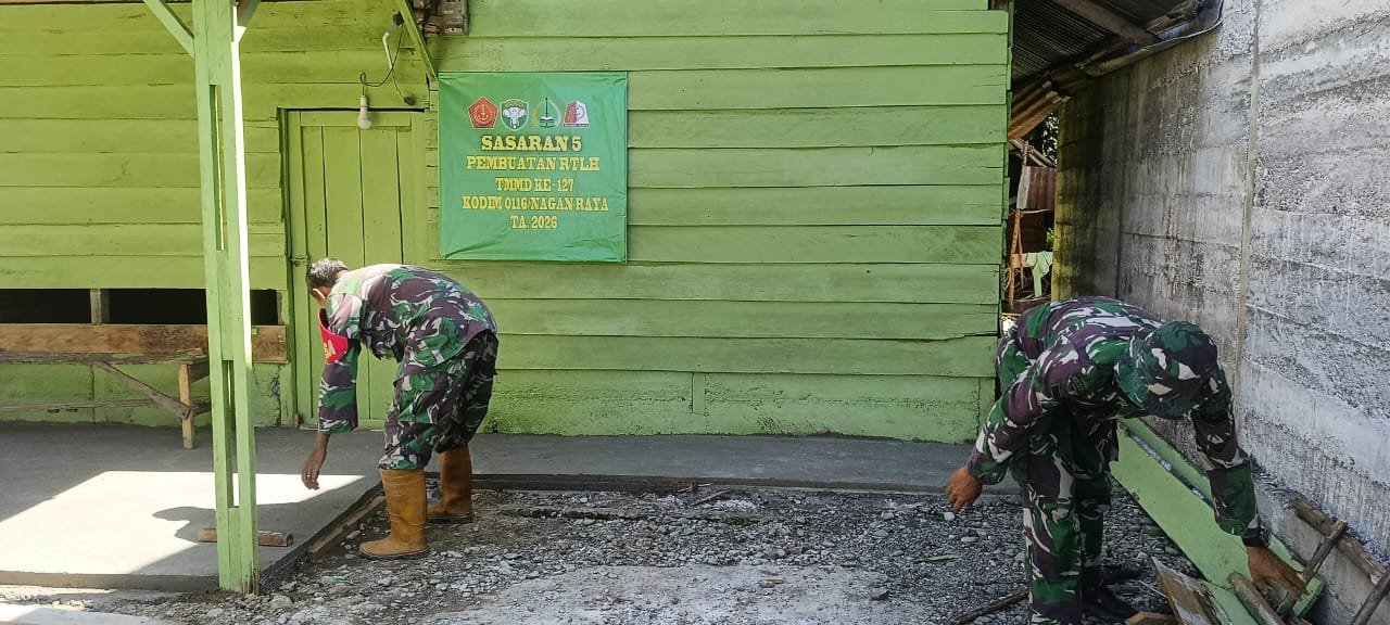 NAGAN RAYA – Program TNI Manunggal Membangun Desa (TMMD) Ke-127 Kodim 0116/Nagan Raya terus menunjukkan progres signifikan. Salah satunya terlihat pada pengerjaan perehaban Rumah Tidak Layak Huni (RTLH) sasaran ke-5 yang kini memasuki tahap lanjutan setelah proses pengecoran teras selesai.