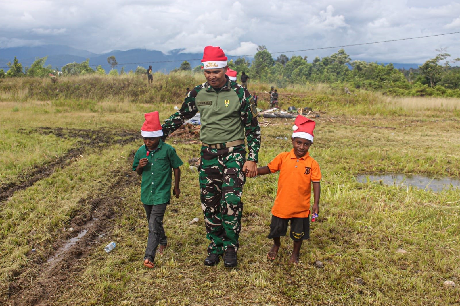 Satgas Pamtas Mobile RI-PNG Yonif 503/ Mayangkara bagikan topi santa dan permen kepada anak – anak sehabis melaksanakan ibadah minggu, di Gereja Kolam Betesda Distrik Kenyam Kabupaten Nduga Papua. Minggu (15/12/2024).