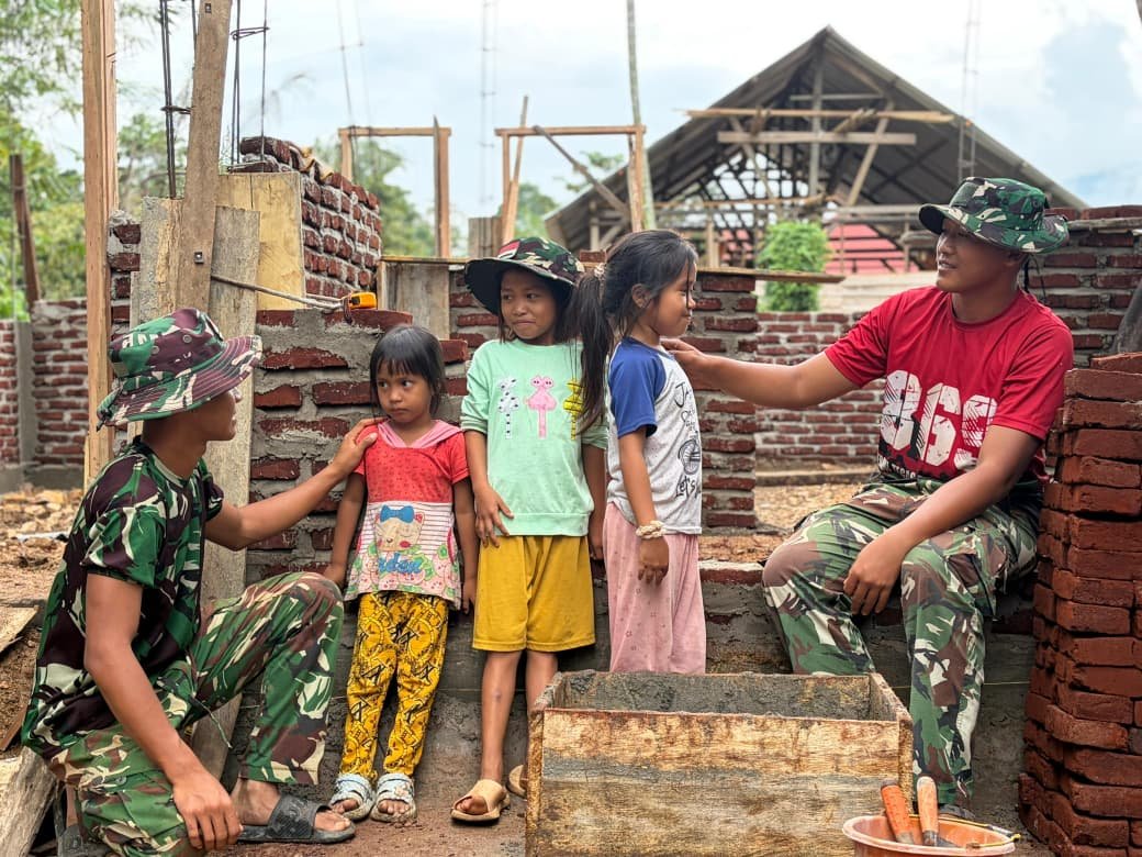Ditengah kesibukan menyusun bahan bangunan, personel TNI tampak sudah berbaur dengan anak-anak desa. Dengan sifat yang ramah, mereka berhasil menciptakan suasana hangat dan akrab, membuat anak-anak yang semula ragu untuk mendekat menjadi lebih terbuka dalam berkomunikasi.