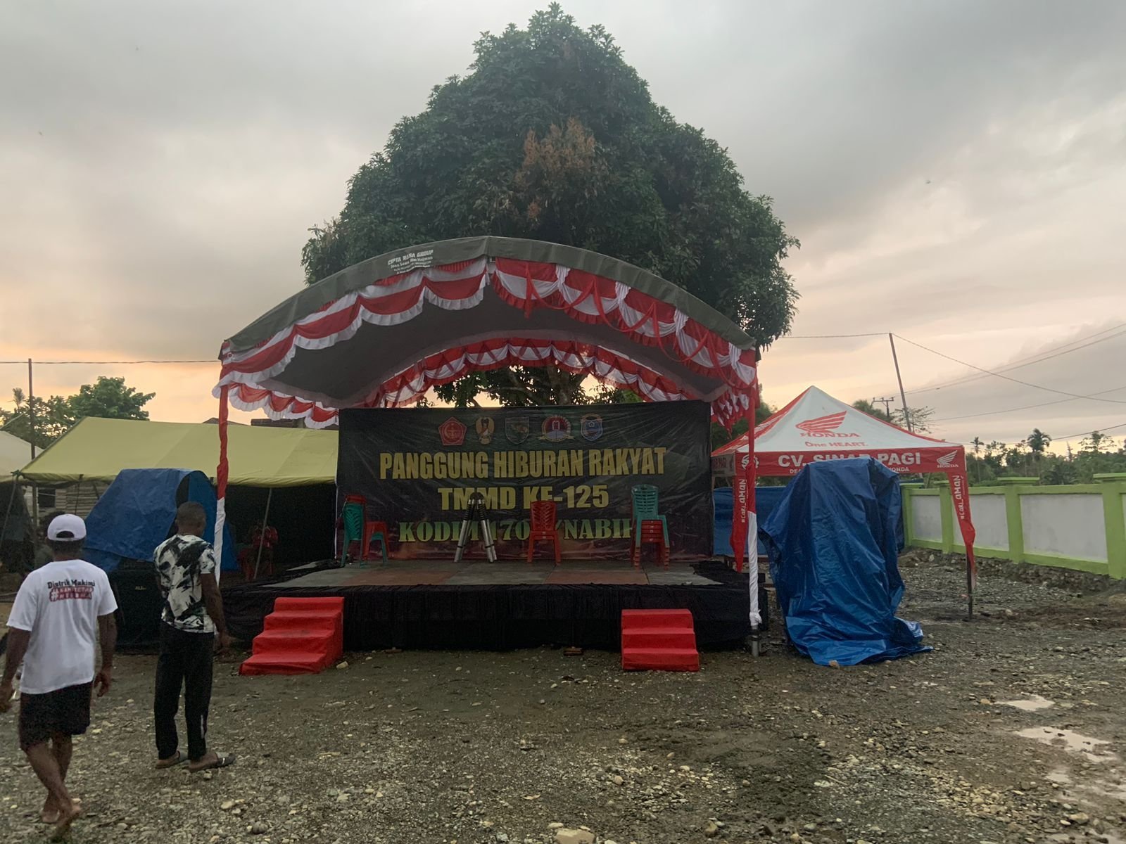 Nabire – Menjelang penutupan TMMD ke-125 TA. 2025, jajaran Kodim 1705/Nabire bersama masyarakat setempat mempersiapkan panggung hiburan rakyat di lokasi sasaran utama kegiatan TMMD, Kampung Manunggal Jaya, Distrik Makimi, Kabupaten Nabire.