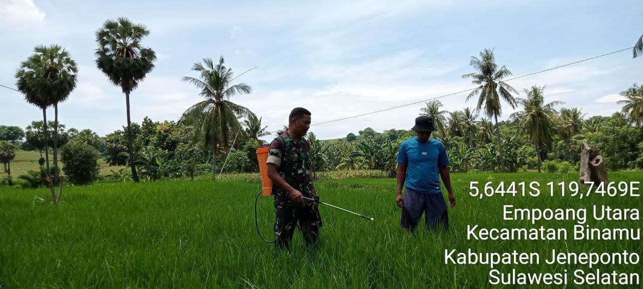 Ketahanan Pangan, Babinsa Koramil 1425-01/Binamu Bantu Petani Semprot Hama Padi