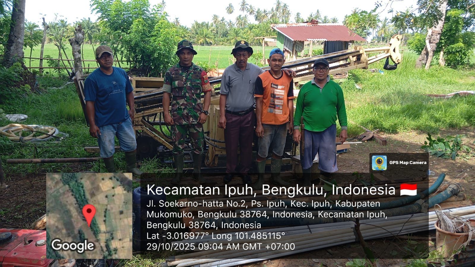 MukoMuko – Dalam upaya mendukung ketahanan pangan dan meningkatkan produktivitas pertanian, Kodim 0428/MukoMuko bersama Pemerintah Kelurahan serta Petugas Penyuluh Pertanian mendampingi Gabungan Kelompok Tani (Gapoktan) dalam pembuatan sumur bor di Desa Pasar Ipuh, Kecamatan Ipuh, Kabupaten MukoMuko, Rabu (29/10/2025).