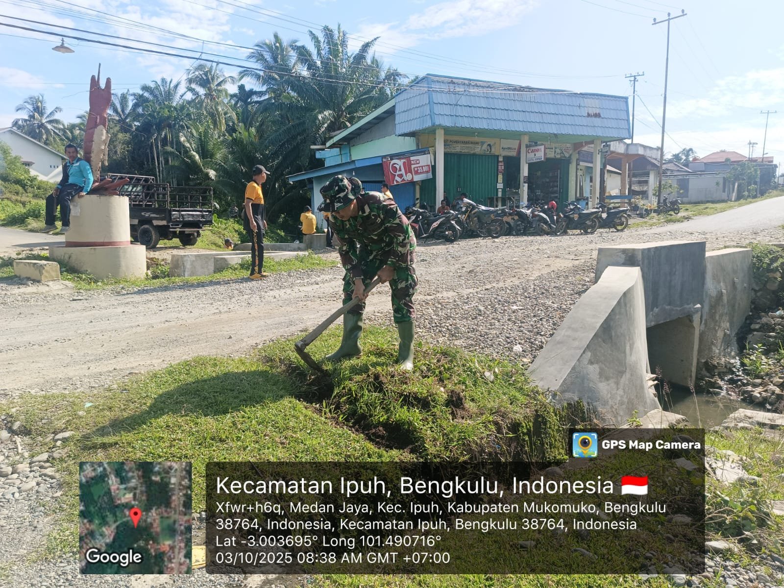 Mukomuko – Suasana gotong royong mewarnai kegiatan karya bakti yang digelar oleh Kodim 0428/Mukomuko bersama masyarakat di salah satu aliran anak sungai di wilayah Desa Medan Jaya Kec. Ipuh Kab. Mukomuko, Jum’at (03/10/2025).