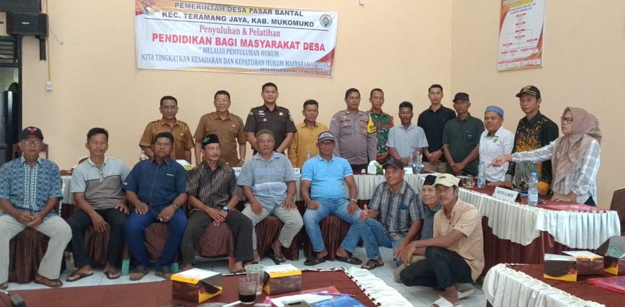 Pendim 0428/MukoMuko – Menghadiri kegiatan penyuluhan/sosialisasi hukum yang dilaksanakan di Aula Kantor Desa Pasar Bantal, Kecamatan Teramang Jaya, Kabupaten MukoMuko, Senin (24/11/2025).