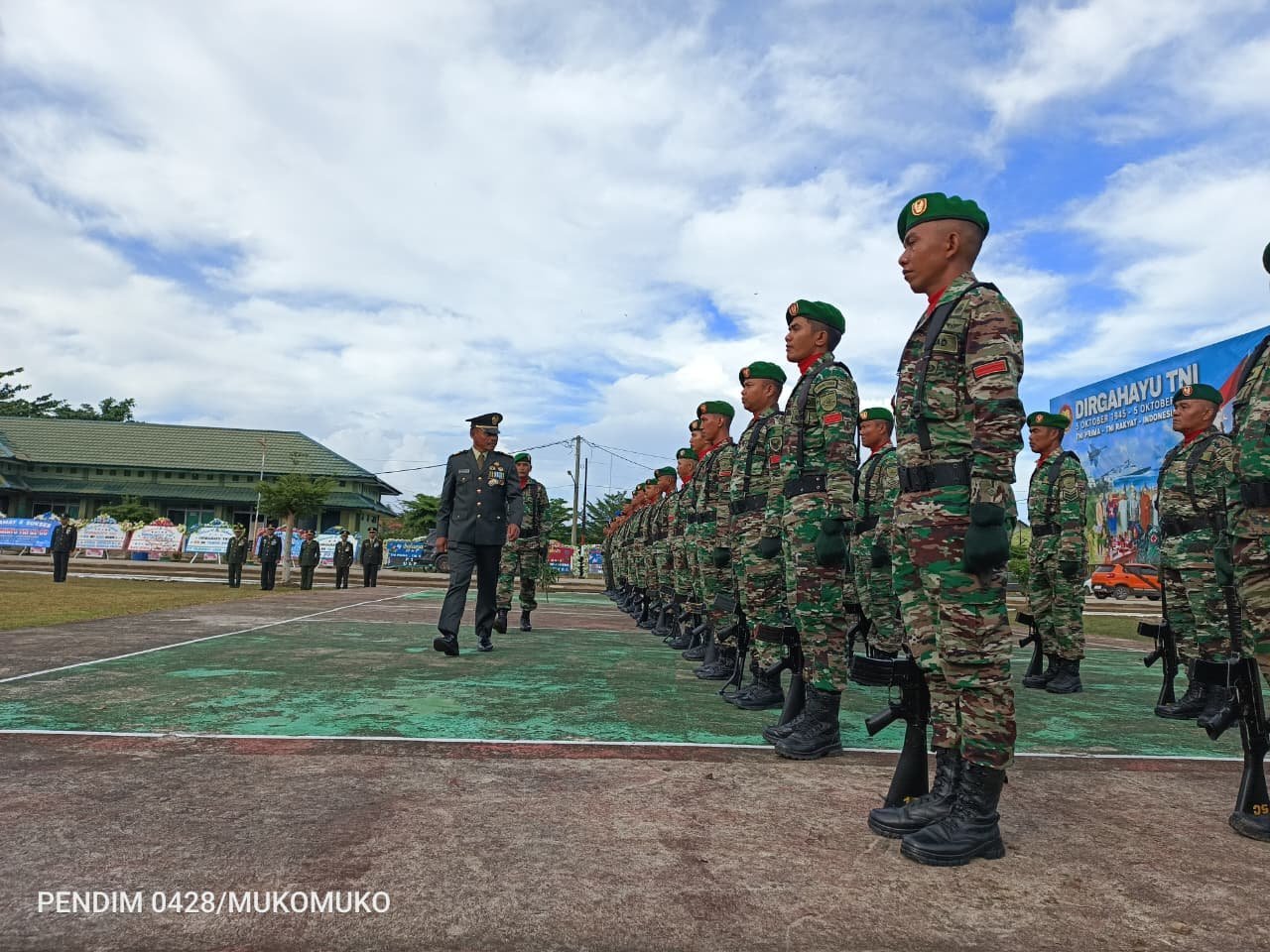 Pasi Ops Kodim 0428/Mukomuko Kapten Inf Budi Syahrian bertindak sebagai Inspektur Upacara, Serta dihadiri oleh seluruh Personel Kodim 0428/Mukomuko, Koramil Jajaran dan Polisi Militer (PM) Sub Denpom/Mukomuko.
