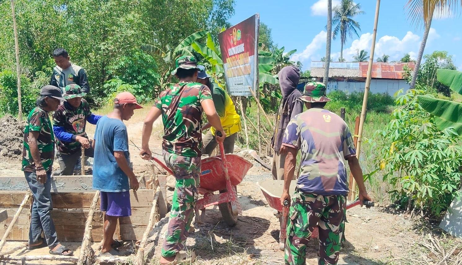 Terlihat langsung di lokasi, Babinsa Koramil 1005-10/Tamban, Sertu Salim, turun tangan langsung dan bekerja bahu-membahu bersama warga setempat. Dengan semangat gotong royong, mereka bersama-sama melakukan pekerjaan pengecoran pondasi jembatan, mulai dari persiapan material hingga proses penuangan beton. Kehadiran Babinsa di tengah masyarakat tidak hanya memberikan dukungan tenaga, tetapi juga menjadi motivasi bagi warga untuk terus berkontribusi dalam pembangunan desa.