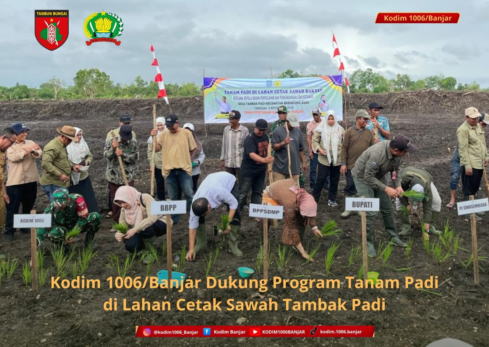 BANJAR – Kodim 1006/Banjar melalui Koramil 1006-11/Aluh Aluh turut berpartisipasi dalam kegiatan Tanam Padi di Lahan Cetak Sawah yang dilaksanakan di Desa Tambak Padi, Kecamatan Beruntung Baru, Kabupaten Banjar, pada Selasa (4/11/2025).