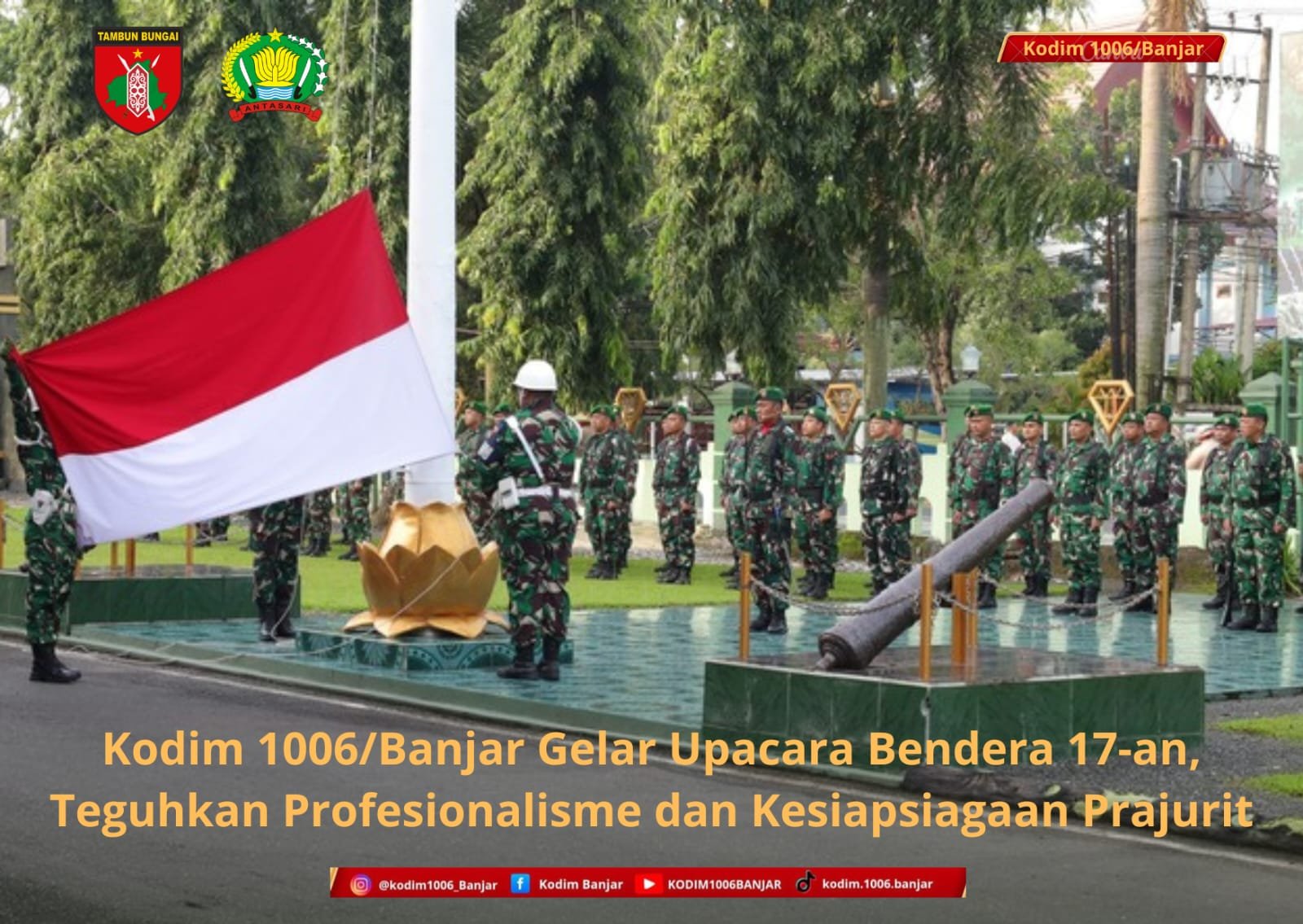 Upacara Bendera Merah Putih 17-an Kodim 1006/Banjar berlangsung dengan tertib, aman, dan lancar. Kegiatan ini menjadi sarana pembinaan tradisi satuan sekaligus wahana untuk meneguhkan komitmen prajurit dan PNS TNI dalam mengabdi kepada bangsa dan negara.(1006).