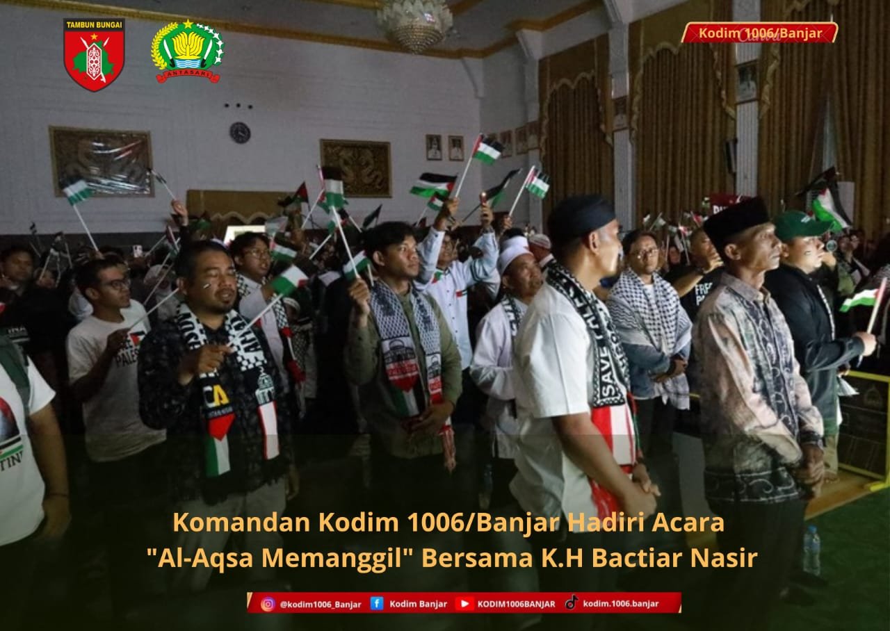 Banjarbaru – Kodim 1006/Banjar melalui Kapten Arh Rusman Istanto menghadiri acara bertajuk “Al-Aqsa Memanggil” bersama K.H. Bachtiar Nasir, Lc., M.M. Kegiatan ini berlangsung di Aula Gawi Sabarataan, Jalan Panglima Batur No.1, Kelurahan Komet, Kecamatan Banjarbaru Utara, Kota Banjarbaru, Minggu (12/10/2025).