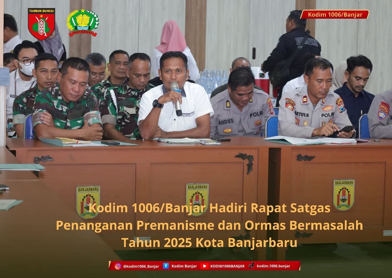 BANJARBARU – Kodim 1006/Banjar turut menghadiri kegiatan Rapat Satuan Tugas (Satgas) Penanganan Premanisme dan Organisasi Kemasyarakatan (Ormas) Bermasalah Tahun 2025 Kota Banjarbaru yang dilaksanakan di Aula Linggangan Intan DPRD Kota Banjarbaru, Rabu (12/11/2025).