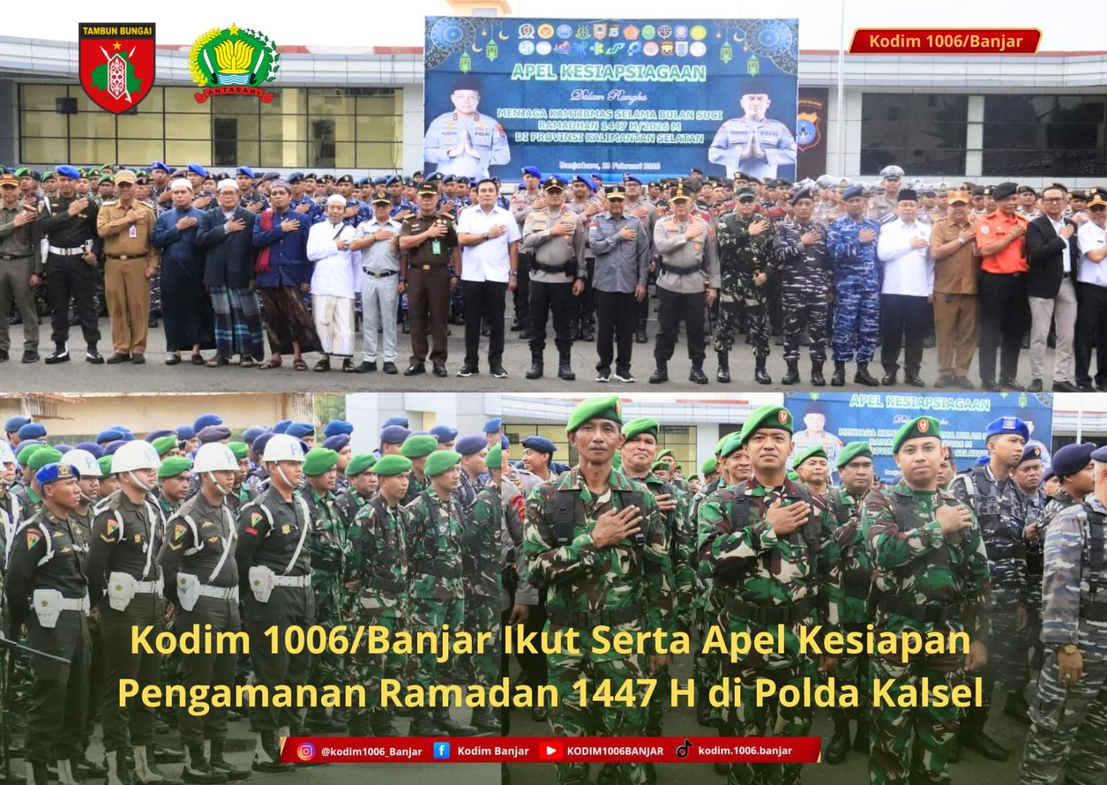 Banjarbaru – Kodim 1006/Banjar ikut serta dalam Apel Kesiapan dalam rangka menjaga keamanan dan ketertiban masyarakat (Kamtibmas) selama Bulan Suci Ramadan 1447 H/2026 M di Provinsi Kalimantan Selatan, yang dilaksanakan pada Senin (23/2/2026) di Lapangan Hitam Mapolda Kalsel, Jalan Dharma Praja, Kawasan Perkantoran Pemprov Kalsel, Kelurahan Cempaka, Kecamatan Cempaka, Kota Banjarbaru.