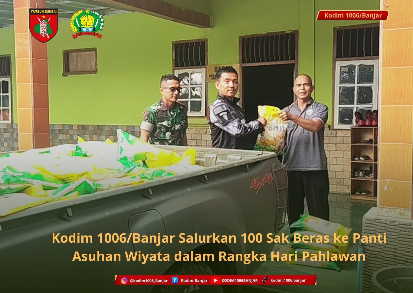BANJARBARU – Dalam rangka memperingati Hari Pahlawan tahun 2025, Koramil 1006-03/Simpang Empat melaksanakan kegiatan penyerahan bantuan sosial berupa 100 sak beras SPHP kepada Panti Asuhan Wiyata yang berlokasi di Jl. Kartika Utama RT.013 RW.006, Kelurahan Guntung Payung, Kecamatan Landasan Ulin, Kota Banjarbaru, Senin (11/11/2025).