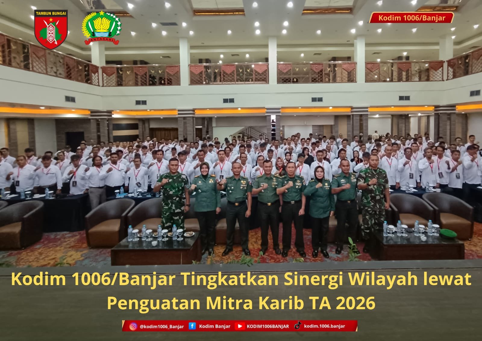 Banjarmasin – Kodim 1006/Banjar turut berpartisipasi dalam Kegiatan Penguatan Mitra Karib Terpusat Tahun Anggaran 2026 yang diselenggarakan oleh Korem 101/Antasari, bertempat di Hotel Aria Barito, Banjarmasin, Selasa (10/2/2026). Kegiatan ini menjadi bagian dari upaya memperkuat pembinaan teritorial serta sinergi antara TNI AD dan komponen masyarakat.