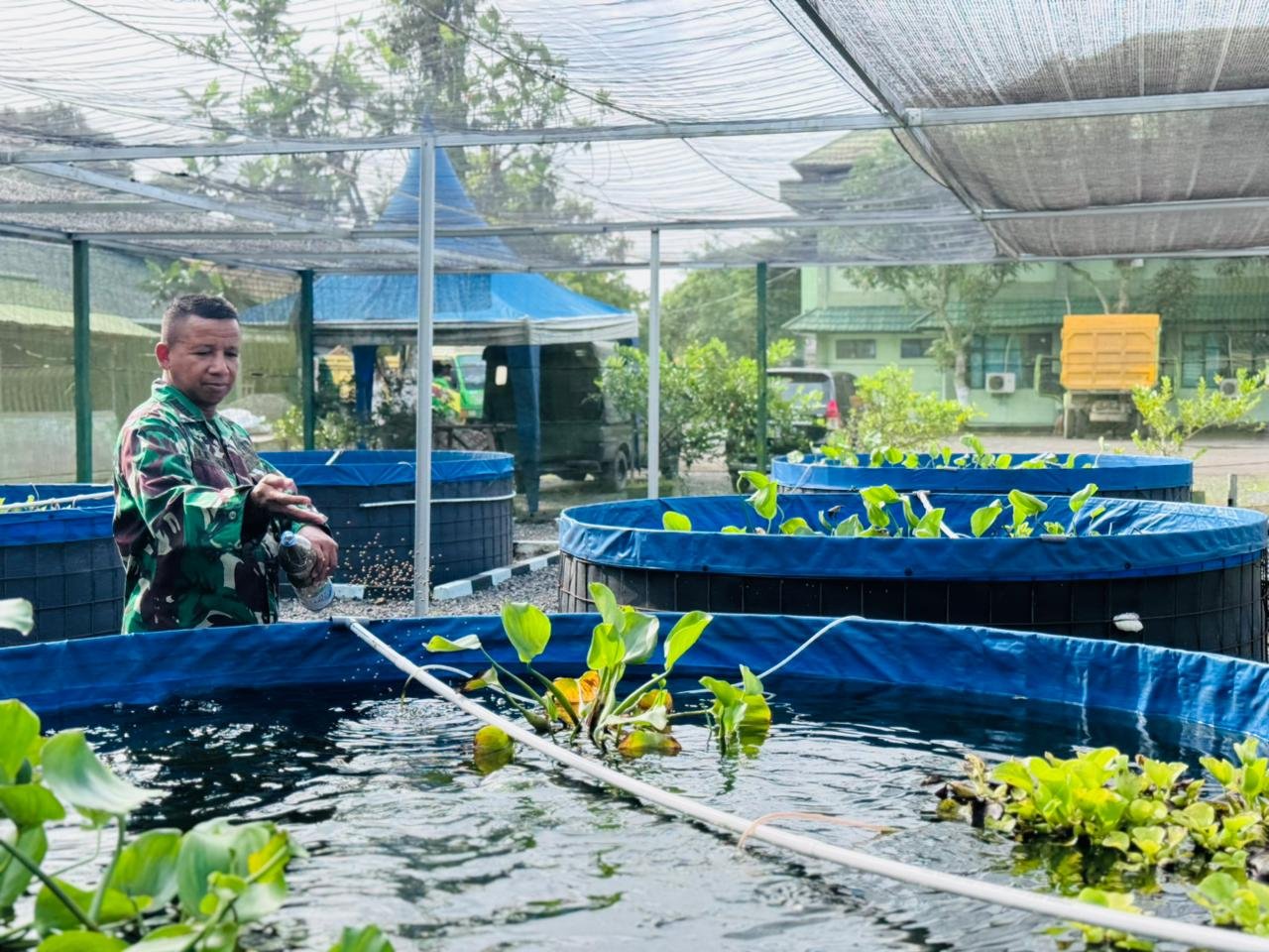 Di tengah riak air kolam yang bergelombang kecil saat ikan-ikan menyambar pakan, kegiatan sederhana tersebut menggambarkan upaya nyata prajurit TNI dalam menjaga ketahanan pangan dari lingkungan sendiri.