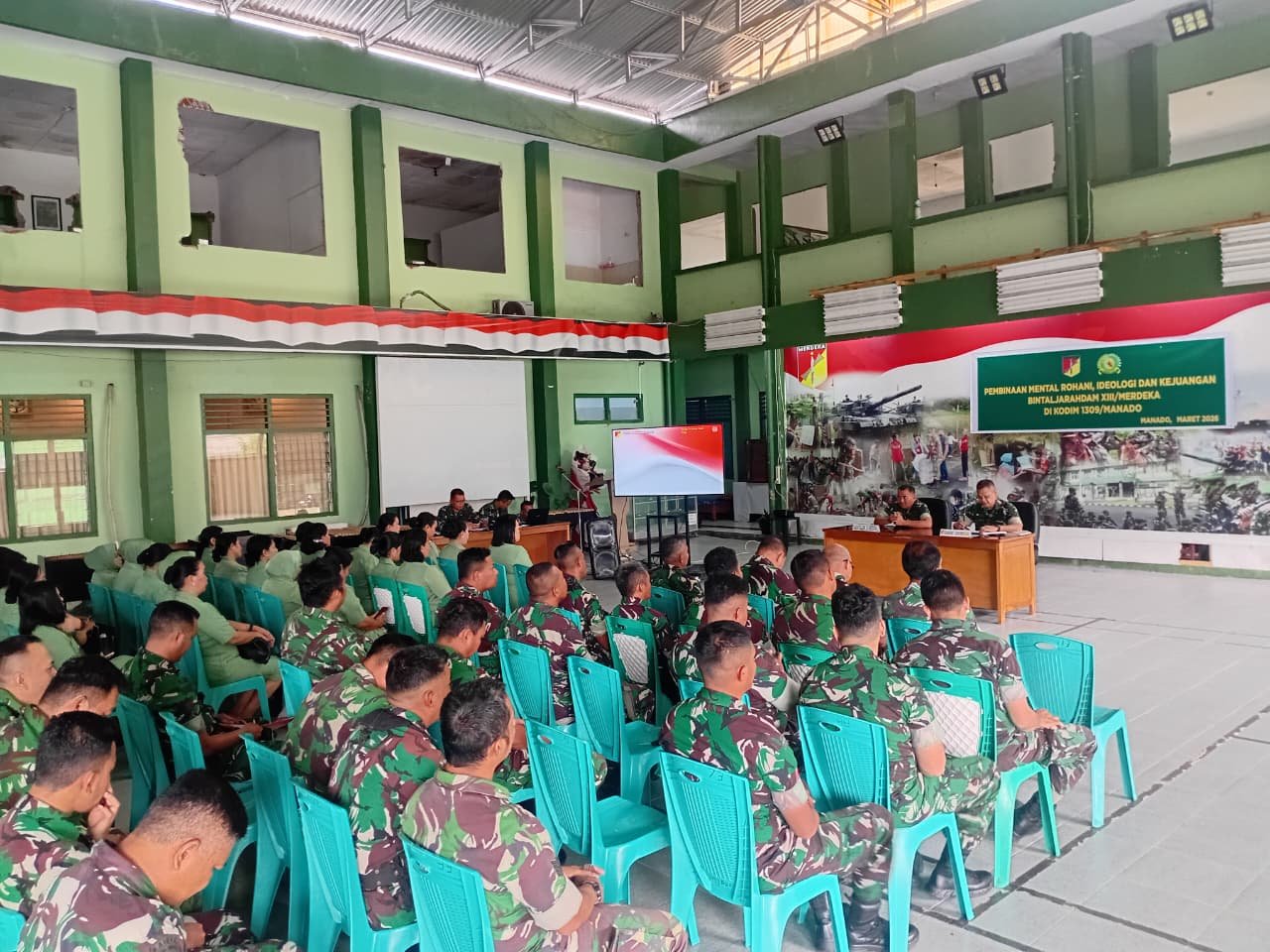 Manado – Kodim 1309/Manado menerima kegiatan pengarahan Pembinaan mental, rohani, ideologi dan kejuangan yang dilaksanakan oleh Bintaljarahdam XIII/Merdeka. Kegiatan tersebut berlangsung di Aula Makodim 1309/Manado dan diikuti oleh prajurit, PNS serta anggota Persit Kartika Chandra Kirana Cabang Kodim 1309/Manado, Kamis (5/3/2026).