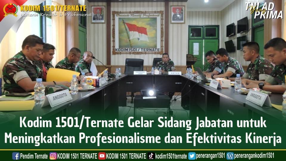 Ternate – Komando Distrik Militer (Kodim) 1501/Ternate menggelar sidang jabatan sebagai bagian dari upaya pembenahan internal demi meningkatkan profesionalisme dan efektivitas kinerja satuan. Sidang jabatan ini dipimpin langsung oleh Pasi Pers Kodim 1501/Ternate, Mayor Inf Rudin Sidangali, dan dihadiri oleh para Perwira Staf dan Danramil jajaran Kodim 1501/Ternate serta anggota. Jumat (1/8/2025).