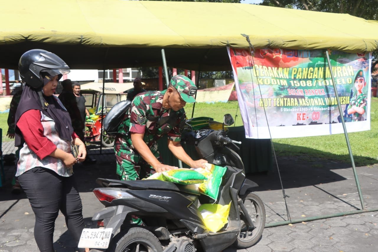 Halmahera Utara, – Dalam rangka memperingati Hari Ulang Tahun (HUT) ke-80 Tentara Nasional Indonesia (TNI), Kodim 1508/Tobelo bekerja sama dengan Dinas Ketahanan Pangan Kabupaten Halmahera Utara melaksanakan kegiatan pendistribusian pangan murah. Acara ini digelar di halaman Rumah Adat Hibualamo, Desa Gamsungi, Kecamatan Tobelo, Kabupaten Halmahera Utara. Selasa (29/9/2025)