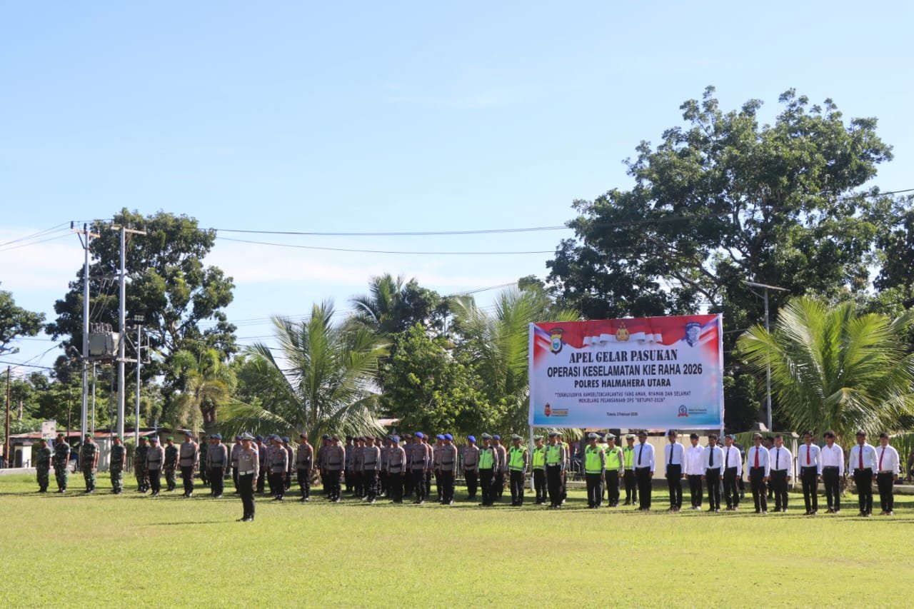 Halmahera Utara – Kodim 1508/Tobelo mengikuti Apel Gelar Pasukan Operasi Keselamatan Kie Raha 2026 yang diselenggarakan Polres Halmahera Utara di Lapangan Upacara Mapolres Halut, Desa Gosoma, Kecamatan Tobelo, Senin (2/2/2026).