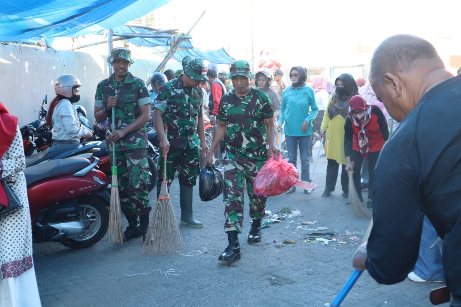 NTB — Sumbawa Besar, Dalam rangka menyambut Hari Ulang Tahun Kemerdekaan Republik Indonesia ke-80, Kodim 1607/Sumbawa menunjukkan kepedulian terhadap lingkungan dengan menggelar aksi gotong royong membersihkan Pasar Seketeng dan sekitarnya, Jumat pagi. Jumat (18/07/2025).