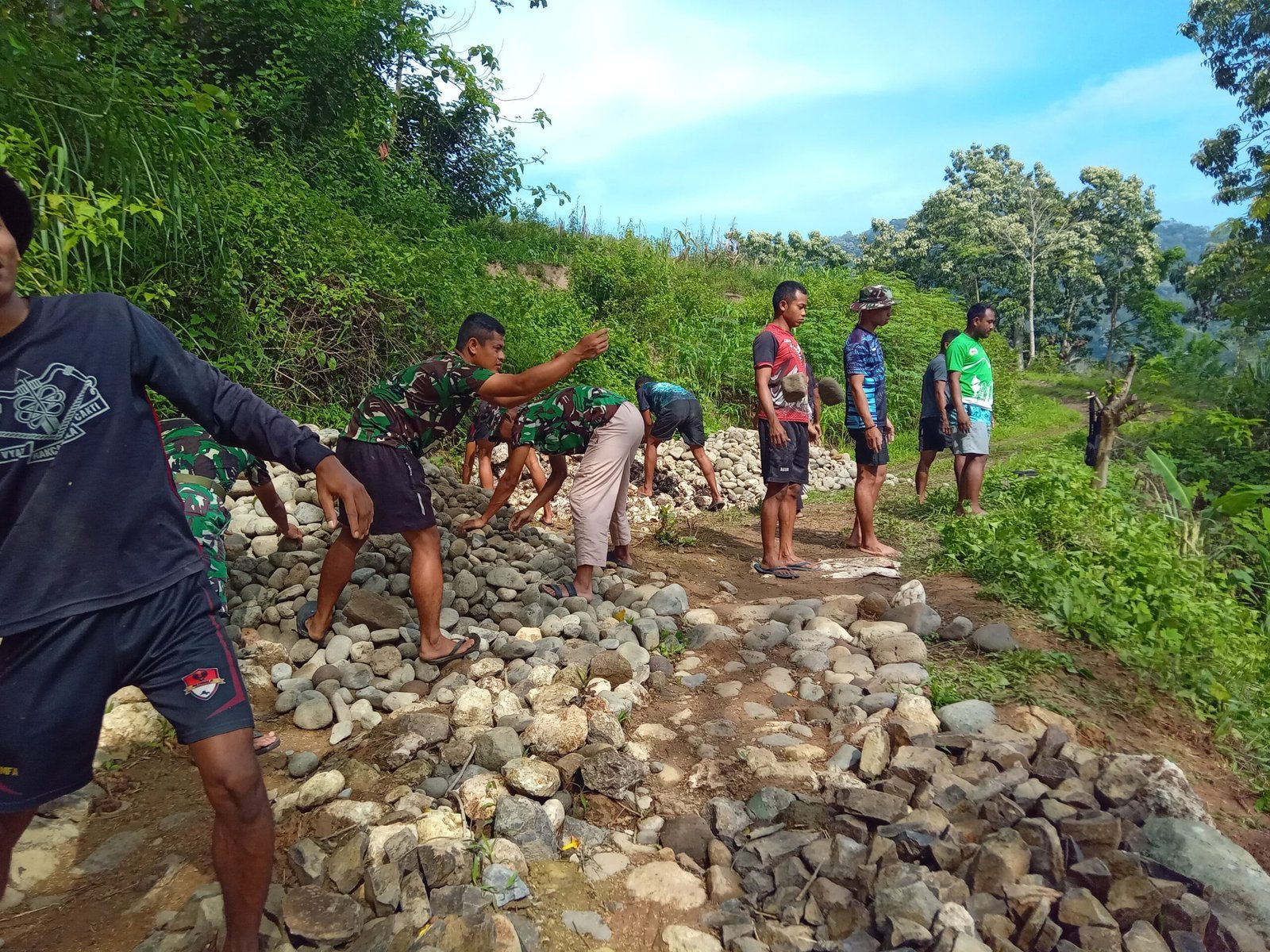 Kegiatan yang berlangsung sejak pagi hari itu disambut antusias oleh masyarakat. Jalan desa yang sebelumnya rusak dan sulit dilalui kini mulai dibenahi agar lebih layak, kuat, dan aman digunakan, terutama saat musim hujan tiba. Gotong royong ini tidak hanya memperbaiki infrastruktur, tetapi juga mempererat tali silaturahmi antara TNI dan warga.