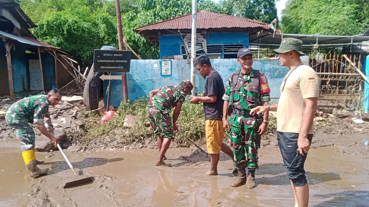 Kodim 1614/Dompu Melaksanakan Karya Bakti Membersihkan Lumpur Di Rumah Warga Akibat Banjir Bandang