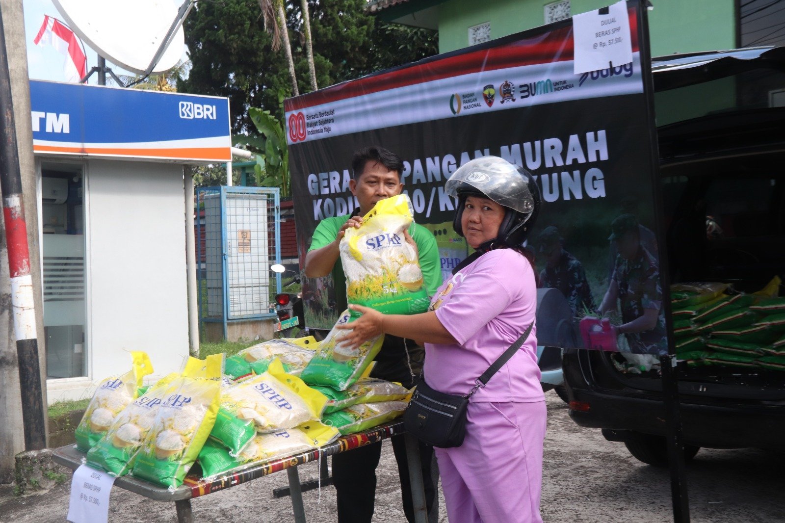 Melalui Gerakan Pangan Murah ( GPM ) ini, kita ingin masyarakat mendapatkan beras dengan kualitas yang baik namun dengan harga yang ekonomis. Untuk beras SPHP dikemas dalam bentuk 5 Kg dengan harga yang diberikan adalag Rp. 57.500,- atau 1 kilo seharga Rp. 11.500,-. Untuk hari ini 100 paket beras 5 kg yang kita sediakan langsung ludes terjual,”pungkas Dandim. ( Pendim 1610/Klungkung ).