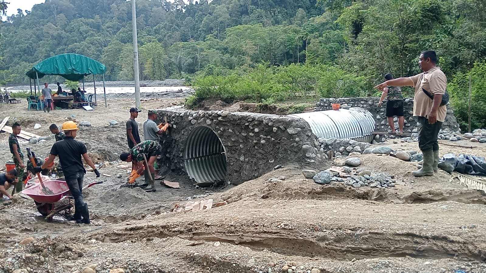 Dandim 0105/Abar Letkol Inf S. Kembaren, S.E., M.I.P., CFrA., menjelaskan bahwa pembangunan wing wall ini merupakan langkah strategis untuk menjaga ketahanan konstruksi jembatan secara keseluruhan.