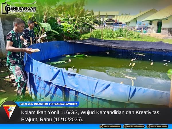 Aceh Barat – Prajurit Batalyon Infanteri 116/Garda Samudra (Yonif 116/GS) terus menunjukkan komitmen dalam mendukung program ketahanan pangan nasional melalui kegiatan budidaya ikan di kolam satuan. Kegiatan ini tidak hanya menjadi bagian dari upaya swasembada pangan, tetapi juga bertujuan menumbuhkan semangat kemandirian, disiplin, dan produktivitas di kalangan prajurit.