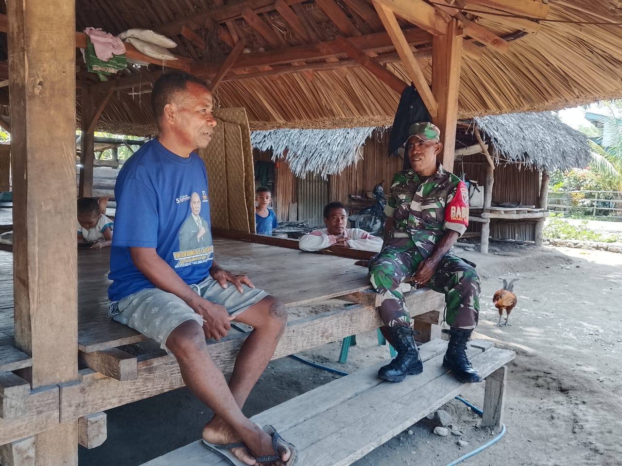 KODIM 1605/BELU, Babinsa Desa Biris Sertu Armindo Daok Koramil 1605-09/Biudukfoho melaksanakan komsos dengan Bapak Weliam Aser Seran selaku Ketua Kelompok Tani di Dusun Haslaran, Desa Biris, Kecamatan Wewiku, Kabupaten Malaka, Senin (6/1/2025).