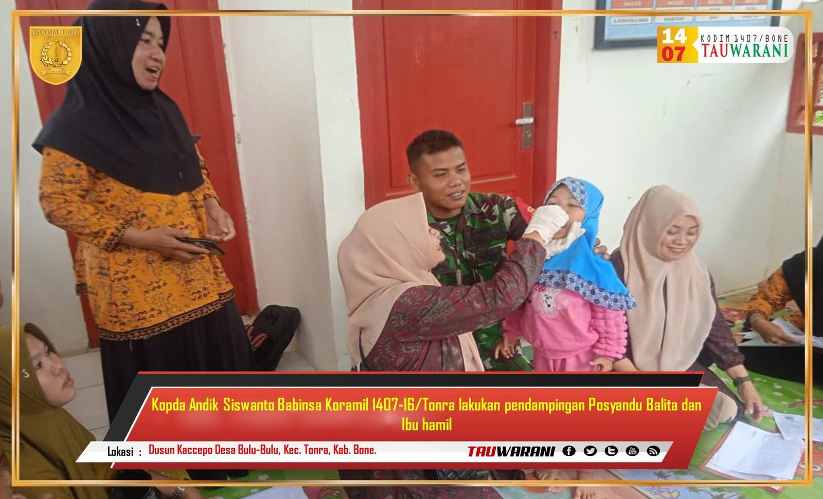 Bone – Sebagai bentuk dukungan terhadap program kesehatan masyarakat, Babinsa Koramil 1407-16/Tonra, Kopda Andik Siswanto, melaksanakan pendampingan kegiatan Posyandu untuk balita dan ibu hamil di Dusun Kaccepo, Desa Bulu-Bulu, Kecamatan Tonra, Kabupaten Bone, Kamis (02/01/2025).
