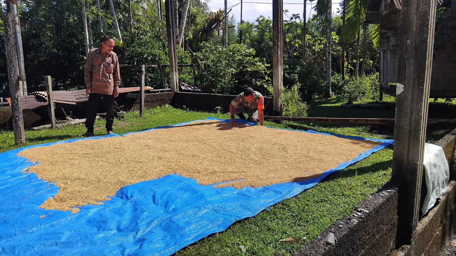 ACEH JAYA — Aktivitas pertanian warga mendapat perhatian dari Babinsa Posramil Pasie Raya Kodim 0114/Aceh Jaya, Kopda Baihaqi. Ia turun langsung membantu Hasnan (58) menjemur padi sebelum dibawa ke kilang untuk proses penggilingan, Kamis (12/02/2026).